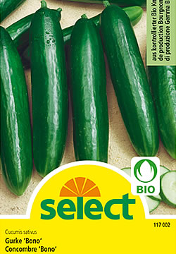 Bio Gurke ‘Bono‘Die robuste Bio-Salatgurke ‘Bono‘ aus Schweizer Produktion gedeiht früh und prächtig im Frühbeetkasten und während des Sommers im Freiland. Die vitalen Pflanzen bilden mittelgrosse, dunkelgrüne und glattschalige Früchte.