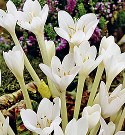 Herbstzeitlose (Colchicum autumnale)Wenn die Knollen im August gepflanzt werden, zeigen sich bereits nach wenigen Wochen die Blüten. Die Blätter erscheinen erst im Frühling und ziehen im Frühsommer wieder ein. Pflanzt man Herbstzeitlosen später, wartet man ein Jahr lang auf die Blüte. Herbstzeitlosen mögen schattige bis halbschattige Standorte. Neben der Verwendung im Garten eignen sie sich zur Pflanzung in Schalen für drinnen, von wo sie nach der Blüte ins Freie umgepflanzt werden können. Alle Pflanzenteile sind stark giftig.