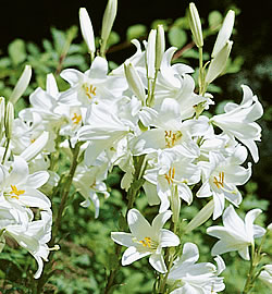 Madonnenlilie (Lilium candidum)Die Madonnenlilie benötigt für ihre Entwicklung etwas länger als andere Lilien-Arten und muss daher im August gepflanzt werden. Im September entwickelt sich dann eine Rosette, die den Winter überdauert. Empfehlenswert ist eine Herbstdüngung und im Winter eine Mulchschicht als Schutz vor Kälte. Der Blütenstängel erscheint im Frühling. Madonnenlilien mögen einen nahrhaften Kalkboden und einen sonnigen, windgeschützten Standort.