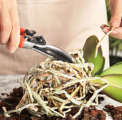 Nein! Auch Orchideen wollen ab und zu umgetopft werden. Weshalb? Die Wurzeln ragen über den Topf hinaus, allenfalls kippt sogar die Pflanze. Die oft als „Luftwurzeln“ bezeichneten Wurzeln sind normale Wurzeln, die im zu klein gewordenen Gefäss einfach keinen Platz mehr finden. Hebt man den Kulturtopf aus dem Übertopf heraus, zeigt sich in diesen Fällen meist das Bild eines dichten Wurzelgeflechts. Substrat ist kaum mehr zu erkennen. So kann eine Pflanze nicht mehr ausreichend Nahrung aufnehmen. Es ist Zeit für das Umtopfen in ein grösseres Gefäss. Genauso ist (sofortiges) Umtopfen angesagt, wenn sich Schädlinge breitmachen oder die Blätter gelb werden. Letzteres deutet auf Wurzelfäulnis hin. Mindestens alle 3 Jahre sollte man einer Orchidee neues Substrat gönnen.
