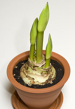 Im Dezember pflanzen wir die Zwiebel in frische mit etwas Sand vermischte Zimmerpflanzenerde, und zwar so, dass sie mindestens 1/3 aus der Erde ragt, und stellen sie im Wohnbereich auf. Der Topf sollte nur ca. 2 cm mehr Durchmesser haben als die Zwiebel. Die Erde wird leicht angefeuchtet. Sobald der neue Blütenstiel etwa 10 cm lang ist, wird wieder wöchentlich mässig gegossen. Zwischen Austrieb und Blüte vergehen in der Regel etwa 8 Wochen. Da der Blütenstängel dem Licht entgegenwächst, sollte man den Topf von Zeit zu Zeit drehen.Man kann Amaryllis auch in Wasserkultur zum Blühen bringen. Dabei ist wichtig, dass nur die Wurzeln im Wasser liegen. Ideal ist eine stark taillierte Vase. So sitzt die Zwiebel in der Taille fest und man kann bis zu den Wurzeln Wasser einfüllen. Fehlt eine solche Vase, kann man aus Draht oder Zweigen ein Gitter konstruieren und dieses in ein gewöhnliches Gefäss einsetzen.