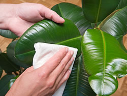 Zu den wichtigsten Pflegemassnahmen für Zimmerpflanzen gehört neben dem Giessen die Blattpflege. Vor allem in der kalten Jahreszeit bei trockener Luft sollten Blätter regelmässig mit einem feuchten Lappen abgewischt werden. Die meisten Zimmerpflanzen, nicht aber Kakteen und andere Sukkulenten, mögen es zudem, wenn sie gelegentlich mit kalkfreiem Wasser besprüht werden.