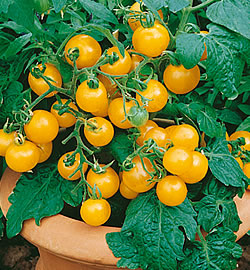 ‘Patio Cherry‘ ist eine Spezialzüchtung für den Anbau im Topf. Sie ist sehr pflegeleicht. Es ist kein Ausbrechen erforderlich, und sie benötigt keine Stütze. Die Buschtomate bringt viele kleine, honiggelbe, aromatische Früchte hervor. Der ideale Standort ist sonnig, am besten vor einer Wärme reflektierenden Hauswand, und regengeschützt.