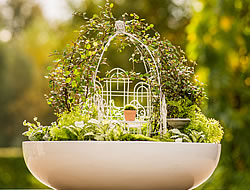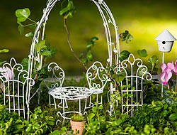 Gartenstühle, Spaliere, Laternen, Rosenbögen, Gartengeräte und vieles mehr, was das Gärtnerherz begehrt, gibt es neu im Kleinstformat. Die Mini-Gartenwelt ist etwas für Kreative mit einem Hang zu Romantik und Freude am Kitschig-Schönen.