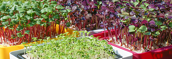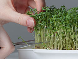 • RadiesCress: Die würzig-frischen Radieschen-Keimlinge sehen mit ihrer dunkelvioletten Farbe äusserst dekorativ aus. Geniessen kann man sie kalt oder warm. Beim Erwärmen büssen sie jedoch etwas an Schärfe ein. Zu Salaten, Dips oder Suppen stellen sie eine ideale Ergänzung dar.