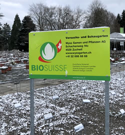 Im rund 25’000 m2 grossen Versuchs- und Schaugarten in Zuchwil wachsen rund 2’500 Pflanzensorten. Was jeweils im Sommer ein einzigartiges Blüten- und Farbspektakel bietet, ruht jetzt im winterlichen Grau. Ein Farbtupfer ist zurzeit lediglich die grosse Tafel, die bestätigt, dass der Garten Bio Suisse zertifiziert ist.