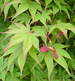 Bemerkungen: malerisch, Zweige können bis zum Boden reichen; bringt rote Flügelfrüchte hervor