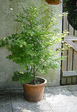 Japanische Ahorne gehören zu den Flachwurzlern. Das Gefäss sollte frostsicher und eher breit als hoch sein, im Durchmesser in etwa so gross wie die Krone des Ahorns. Wichtig ist ein guter Wasserabzug. Zudem ist eine 5 – 10 cm hohe Drainageschicht aus Greenplant oder Blähton empfehlenswert. Als Substrate sind Universalerde mit Greenplant oder Kübelpflanzenerde geeignet. Jeweils im Frühjahr wird mit einem Langzeitdünger gedüngt. Die Erde sollte immer leicht feucht sein. Junge pflanzen topft man alle 2 – 3 Jahre um; bei älteren Exemplaren reicht ein Umtopfen alle 6 – 8 Jahre.Der Japanische Ahorn ist gut winterhart. Bei langeanhaltenden sehr starken Frösten ist es ratsam, das Gefäss mit Luftpolsterfolie oder Jute einzupacken und an eine windgeschützte Hauswand zu stellen.