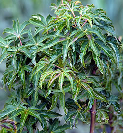 Laub: gross, tiefgeschlitzt; olivgrün, glühendrote Herbstfärbung