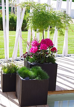 Nicht nur in einem klassischen Asia-Garten machen Japanische Ahorne eine gute Figur. Man kann sie auch gut als Kübelpflanzen halten und damit die Terrasse oder den Balkon verschönern. Im Gefäss entwickeln sie sogar noch eine intensivere Herbstfärbung als ausgepflanzt.