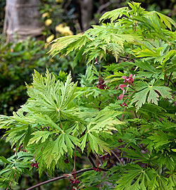 Laub: sehr dekorativ, stark geschlitzt, fein gesägt; dunkelrot, leuchtend rote Herbstfärbung