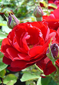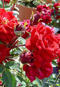 Merkmale: Höhe ca. 60 – 100 cm; mehrfach blühend; gute Fernwirkung mit wenigen Pflanzen; mehrere Wochen andauernde üppige Blüte; sehr robust. Polyantharosen haben einen gedrungenen, buschigen Wuchs mit Doldenblüten oder grösseren Blütenbüscheln; die eher kleinen Blüten sind meist locker gefüllt und haben oftmals schön gewellte, flatterige Blütenblätter. Bei den Floribundarosen sind schalenförmige Blüten oder Blüten, die den Edelrosen sehr ähnlich sind, zu finden; auch sie sind ideal zur Beetbepflanzung.Tipps: In Kübel gepflanzt, bringen sie Blütenpracht und Farbe auf Balkon oder Terrasse. Geben mit wenigen Zweigen schön füllige Rosensträusschen.