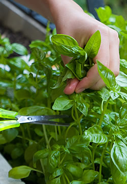 Will man möglichst lange feines Basilikum geniessen, sollte man dafür sorgen, dass es gar nicht erst zur Blütenbildung (ca. ab Juli) kommt. Ist es mal soweit, werden die Blätter zäh, und die Pflanze kümmert vor sich hin. Deshalb sollte man auch nie nur einzelne Blätter ernten, sondern immer ganze ca. 10 cm lange Triebspitzen knapp über einem Blattpaar abschneiden. So kann die bestehende Pflanze von dort aus wieder neu austreiben und sich verzweigen; die Lebensdauer der Pflanze verlängert sich dadurch. Auf diese Weise gewinnt man auch Stecklinge, um neue Pflanzen zu kultivieren.Basilikum durch Stecklinge vermehren