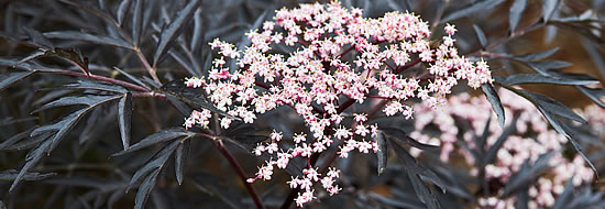 Der farnblättrige Holunder ‘Black Lace®’ mit dem sehr dekorativen schwarzroten tief geschlitzten Laub ist eine äusserst interessante Alternative zu einem japanischen Ahorn. Er wächst breitbuschig, wird nur 2 – 2.5 m hoch und ist deshalb auch für kleine Gärten geeignet.