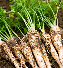 Ein Jungpflanzenangebot gibt es nicht. Wer in den Genuss von Petersilienwurzeln aus eigener Kultur kommen möchte, muss zur Samentüte greifen. Das Wintergemüse kann von März bis Juni direkt ins Freie gesät werden. Der Boden sollte humusreich, locker und leicht feucht, der Standort warm und halbschattig bis sonnig sein. Idealerweise arbeitet man vor der Aussaat etwas reifen Kompost in den Boden ein. Wichtig ist, Unkraut regelmässig zu entfernen, damit es die Keimlinge und später die jungen Pflanzen nicht überwächst. Wie Karotten müssen auch junge Petersilienwurzel-Pflänzchen vereinzelt werden, damit sich die Rüben gut entwickeln können. In der Wachstumsphase (bis Mitte Juni) benötigt die Petersilienwurzel reichlich Wasser. Petersilienwurzeln sollten erst nach 3 – 4 Jahren wieder am selben Platz kultiviert werden. Sie sollten auch nicht dort angebaut werden, wo unmittelbar zuvor andere Doldenblütler wie Sellerie, Koriander oder Dill gewachsen sind.Ernte und Verwendung