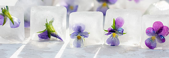 Bunte Blüten lassen sich auch zusammen mit Wasser zu attraktiven Eiswürfeln einfrieren. Damit dekorieren Sie rasch einen Sirup, Eistee oder auch nur Mineralwasser. Wer Blüten(-Blätter) im Sommer trocknet, hat sie während des ganzes Jahres zur Verfügung.