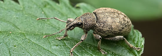 Eingefressene Buchten in Blättern von Rhododendren, Spindelsträuchern, Erdbeeren, Rosen, Johannisbeeren, Buchsbäumen, Mandevillas und vielem mehr sind ein Zeichen dafür, dass der Dickmaulrüssler am Werk ist. Nicht nur Blätter, auch Wurzeln, nehmen Schaden von diesem Käfer beziehungsweise dessen Larve.