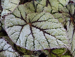 Lichtbedarf: Mittel, keine direkte Sonne.Wuchs: Breitbuschig, höchstens 30 cm. Hat attraktiv asymmetrische, grau-silbrige Blätter mit purpurroter Nervatur (Schiefblattgewächs).