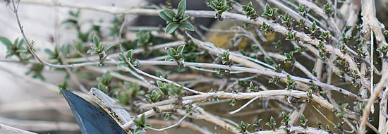 Verholzende Kräuter wie Bohnenkraut, Lavendel, Rosmarin, Salbei, Thymian, Currykraut oder Gewürzlorbeer können jetzt zurückgeschnitten werden. So können sie aus dem alten Holz wieder neu austreiben und buschig heranwachsen. Bodeneben abgeschnitten werden Minze, Oregano oder Schnittlauch.Kräutern, die in einem Gefäss wachsen, gönnt man etwas neue Kräutererde oder Universalerde mit Greenplant. Zum Saisonstart werden einige Kräuterpflanzen auch wieder mit Dünger (z. B. Wyss Bio Kräuterdünger) versorgt. Wichtig ist dies vor allem bei Liebstöckel (Maggikraut), Minze und Schnittlauch, die alle einen gehaltvollen Boden mögen. Hingegen ist bei mediterranen Kräutern wie Rosmarin, Salbei oder Thymian Zurückhaltung angebracht, da sie einen mageren Boden bevorzugen. Darauf muss auch geachtet werden, wenn man verschiedene Kräuter zusammen in einen Topf pflanzt – Wasser- und Nährstoffbedarf sollten in etwa gleich sein.