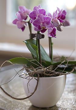 Wird das Substrat erdig, sollte am Ende der Blütezeit umgetopft werden (nicht im Winter). Blätter gesunder Phalaenopsis sind hart. Werden sie weich und gelb, muss sofort umgetopft werden (Wurzelfäule). Weiche Wurzeln und Rispen werden dann entfernt und der Wurzelballen abgewaschen. Luftwurzeln gehören in den Topf. Möglichst einen kleinen Plastiktopf verwenden. Für die Kultur ist spezielle Orchideen-Erde auf Basis von Baumrinde zu empfehlen.Phalaenopsis-Orchideen sind inzwischen so preiswert geworden, dass es bei meinen Exemplaren gar nicht mehr zum Umtopfen kommt. Gefällt mir eine Pflanze mit der Zeit nicht mehr, sei es zum Beispiel wegen unschöner Blätter oder zu vieler Luftwurzeln, gebe ich sie auf und gönne mir eine neue.