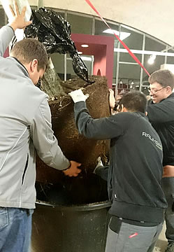 Am Dienstag, 17. November 2015, empfingen wir den Ficus lyrata, den wir bei unserer Geschäftseinheit Raumbegrünung bestellt hatten, im GartenHaus Zuchwil mit offenen Armen. Auf 12 sogenannten CC-Wagen wurde er mit vereinten Kräften in die Kuppel bugsiert. Mit Hilfe des Heli (= Gabelstapler) wurde er aufgestellt und in ein schmuckes Edelstahlgefäss gehievt. Zu zweit wurde ihm vorgängig an den Wurzeln „gekitzelt“ (um etwas Erde vom Ballen wegzukriegen), so dass er schliesslich schön ins Greenplant-Substrat gebettet werden konnte.
