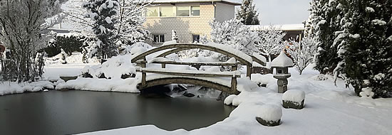 Im Weiteren gilt es, die Wasserleitungen im Garten, Hof, Keller oder in der Garage zu schützen. Vor den ersten strengen Dauerfrösten müssen die Wasserzufuhr gesperrt und die Leitungen entleert sein. Wenn das Wasser in der Leitung gefriert, drohen Wasserschäden durch das Platzen der Leitung. Gleiches gilt beispielsweise auch für Brunnen. Auch in Gartenschläuchen und Regentonnen sollte sich im Winter kein Wasser befinden.Gibt es einen Gartenteich mit Fischen, darf nie die ganze Oberfläche zugefroren sein. Eine Massnahme ist, die Teichpumpe mit geringer Leistung den ganzen Winter hindurch laufen zu lassen. Eine andere Variante ist, einen sogenannten Eisfreihalter aufs Wasser zu legen.