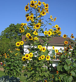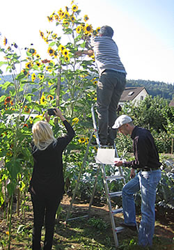Im September erreichte uns eine erfreuliche E-Mail unseres Kunden Willy Maurer. Er habe eine prächtige, gar rekordverdächtige Sonnenblume im Garten seines Vaters, Ernst Maurer (selber jahrelanger Gemüsebauer und Wyss-Kunde), stehen. Sie könnte aus unseren Select-Samen entstanden sein.