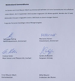 Im Jahr 2014 hat Familie Maurer unsere Blumenmischung „Prachtmischung“ ausgesät. Ein Jahr später gedeiht diese Wunder-Sonnenblume genau an diesem Ort. Es wird angenommen, dass die letztjährigen Blumen sich versamt haben. Diese Sonnenblume trage 130 Blüten, was einen neuen Rekord bedeuten würde. Die Anzahl werde man noch von amtlicher Stelle prüfen lassen, und die Wyss Samen und Pflanzen AG sei herzlich dazu eingeladen.
