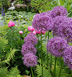 - Attraktive Kombinationen: Sehr schöne Kombinationen ergeben sich, wenn Zierlauch mit Nadelgehölzen, Funkien, Wolfsmilch, Gräsern oder Pfingstrosen kombiniert wird. Um die bestmögliche Wirkung zu erzielen, sollten die Blüten des Zierlauchs andere Gewächse um mindestens einen Drittel überragen.