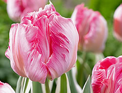 Papagei Tulpe ‚Elsenburg‘Das Farbenspiel mit feinen Verläufen von hellrosa bis rot ist genauso einzigartig wie die federartig gefransten Blütenblätter. Diese spät blühende Sorte wird 40 cm hoch. Sie ist auch eine gute Schnittblume.