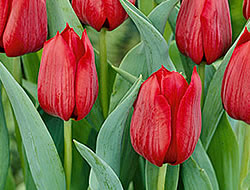 Tulpe ‚Pallade‘Sie ist im Garten ein Blickfang und eignet sich mit einer Höhe von nur 30 cm auch bestens zur Gefässbepflanzung. Die mittelfrüh in kräftigem Dunkelrot blühende Sorte ist auch eine gute Schnittblume.