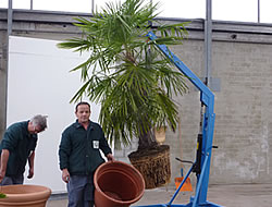 Ist das Gefäss zu klein, wird nach Rücksprache mit dem Kunden die Pflanze in ein grösseres umgetopft. Idealerweise geschieht dies zwischen Oktober und Ende Dezember. Mitte März beginnen die Vorbereitungen für die Auslieferung, die wiederum abhängig von der Witterung etwa Mitte April beginnt.Wie viele Personen beschäftigen sich mit der Pflanzenüberwinterung?