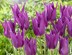 Lilienblütige Tulpe ‚Yume no Marasaki‘Die Sorte ‘Yume no Marasaki‘ ist spätblühend und wird 35 cm hoch. Die violetten Blütenblätter verlaufen zugespitzt; der obere Teil ist nach aussen gebogen. Dadurch wirkt diese Tulpe äusserst elegant, im Garten wie auch als Schnittblume in der Vase.