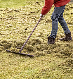 - Das Vertikutiergerät wird einmal längs und einmal quer über die Rasenfläche geführt, dann das Material zusammengerecht und weggeführt.