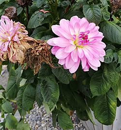Meiner ‚Christine‘ (ja, die Sorte ist meine Namensvetterin) haben die kürzlichen starken Regenfälle schon etwas zugesetzt. Die braunen Stellen und Überreste von Blüten sind kein schöner Rahmen für die neuen bezaubernden rosa Blütenköpfe, die sich bereits wieder gebildet haben.Was ich längst hätte tun sollen, wurde am vergangenen Wochenende endlich erledigt: Die Pflanze wurde gründlich ausgeputzt. Blütenköpfe, die beginnen ihre Blütenblätter zu verlieren, sollte man möglichst rasch abschneiden, und zwar bis zu den darunterliegenden Seitentrieben, an denen sich wieder neue Knospen gebildet haben.