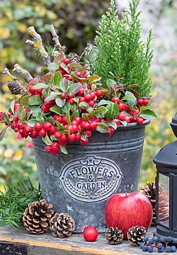 Wir finden die Scheinbeere im Handel als Herbstpflanze, obwohl sie das Zeug zu einer Ganzjahrespflanze hat. Im Winterhalbjahr erfreut sie mit den leuchtendroten kugeligen Beeren und dem interessant gefärbten Blattkleid. Im Sommer erscheinen zarte kleine weissen Blüten. Die immergrüne winterharte Scheinbeere ist für Kistchen und Tröge eine gute Basispflanze, zu der man je nach Saison immer wieder anderes dazu pflanzen kann. Schöne Kombinationen ergeben sich im Herbst mit Mini-Koniferen, Purpurglöckchen (Heuchera), Efeu, Besenheide (Calluna), Skimmie (Skimmia japonica) oder im Winter dann mit Christrosen (Helleborus).