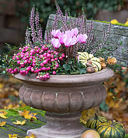 Herbstpflanzen mit Früchten erfreuen uns über viele Wochen und bringen als Begleitung zu Heidepflanzen, Gräsern, Nadelgehölzen, Chrysanthemen und Blattschmuckpflanzen Abwechslung in Blumenkistchen und andere Gefässe.