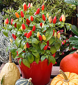 Ein fulminantes Feuerwerk leuchtender Farben bergen die Früchte dieser Pflanzen. Das Spektrum reicht von gelb, grün, orange, rot, violett bis zu weinrot. Je nach Sorte sind die Früchte rundlich, spitz oder langgezogen. Der Zierpfeffer ist zwar nicht winterhart, bleibt aber bei frostfreier Witterung bis in den Winter hinein schön. Übrigens: Die Schoten sind essbar. Je nach Sorte sind sie mild wie Peperoni oder scharf wie Chilis. Der Zierpfeffer macht sich gut allein in einem Topf oder auch in einem Kistchen oder grösseren Gefäss, zum Beispiel kombiniert mit Alpenveilchen (Cyclamen), winterharten Purpurglöckchen (Heuchera), Silberblatt (Lunaria), oder Segge (Carex).Wyss Samen und Pflanzen AG, Christine Beuret