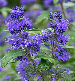 Bartblume (Caryopteris): Die Bartblume ist ein buschig wachsender Kleinstrauch, der etwa 1 m hoch wird. Die intensiv dunkelblauen duftenden Blüten erscheinen von August bis September. Die Bartblume benötigt einen sonnigen Platz und einen durchlässigen Boden. Auch als Kübelpflanze macht sie viel her.