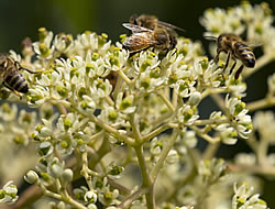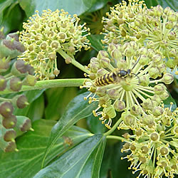 Strauchefeu (Hedera helix ‘Arborescens’): Auch Efeu kann eine wertvolle Insektenweide sein, so zum Beispiel der pflegeleichte Strauchefeu mit seinen grün-gelben duftenden Doldenblüten, die er von September bis Oktober hervorbringt. Dieses immergrüne Gehölz gedeiht an jedem Standort, sofern er nicht zu trocken ist. Der Strauchefeu wächst breitbuschig und wird bis ca. 1.2 m hoch. Er eignet sich auch als Kübelpflanze.