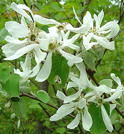 Gewöhnliche Felsenbirne (Amelanchier ovalis): Die einheimische Gemeine Felsenbirne hat nichts mit Birnen zu tun. Der mehrstämmige Strauch mit locker überhängenden Zweigen wird nur rund 1.5 – 2 m hoch und bildet Früchte, die eher an Heidelbeeren erinnern. Der ideale Standort ist sonnig bis halbschattig. Im April erscheinen unzählige Büschel mit weissen Sternblüten.