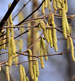 Gewöhnliche Hasel (Corylus avellana): Die einheimische Haselnuss ist ein vieltriebiger buschig aufrecht wachsender Grossstrauch, der eine Höhe von 4 – 5 m erreicht. Trotz seiner Grösse gilt er als sehr windfest. Für ihn ist ein sonniger bis halbschattiger Platz optimal, doch er kommt auch mit Schatten zurecht. Der Boden soll nährstoffreich sein. Die gelben Blütenkätzchen erscheinen von Februar bis März.