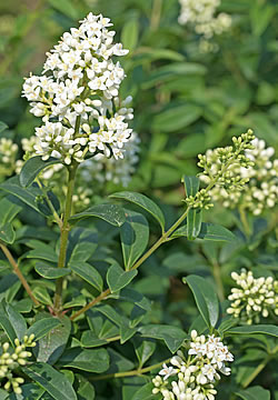 Gewöhnlicher Liguster (Ligustrum vulgare): Der einheimische wintergrüne Strauch wächst breitbuschig aufrecht bis zu einer Höhe von 2 – 3 m. Er kann an jedem Standort gepflanzt werden; er ist auch hitzeverträglich. Der Boden sollte nährstoffreich sein. Seine Rispen mit den crème-weissen angenehm duftenden Blüten erscheinen von Juni bis Juli. Der Liguster macht sich auch gut als Kübelpflanze.