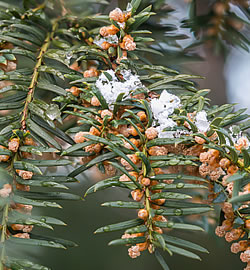Gewöhnliche Eibe (Taxus baccata): Die einheimischen immergrünen Eiben sind sehr langsam und dicht wachsend. Sie können 6 – 8 m hoch werden. Sie sind pflegeleicht und für alle Standorte geeignet; am besten ist jedoch Halbschatten oder Schatten. Der Boden soll nährstoffreich und feucht sein. Die unscheinbaren gelben Blüten, die von März bis April erscheinen, sind für uns Menschen kein Blickfang, dafür aber für die Insekten sehr wertvoll.