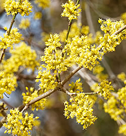 Kornelkirsche (Cornus mas): Der einheimische langsam breit aufrecht wachsende Strauch oder Baum wird 4 – 5 m hoch. Die sehr dekorative Kornelkirsche benötigt einen sonnigen bis halbschattigen Platz. Sie ist hitzeverträglich und trockenheitsresistent. Von März bis April, vor dem Laubaustrieb, bildet sie sehr zahlreiche grosse kugelige Dolden mit goldgelben sternförmigen Einzelblütchen, die leicht duften.