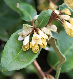 Ölweide (Elaeagnus ebbingei): Der immergrüne aufrecht wachsende dicht belaubte Strauch erreicht eine Höhe 2 – 2.5 m. Die silbrig-weissen eher unscheinbaren röhrenförmigen duftenden Blüten erscheinen von September bis November. Die Ölweide mag einen sonnigen bis halbschattigen Platz und einen trockenen Boden. Sie eignet sich auch gut als Kübelpflanze.