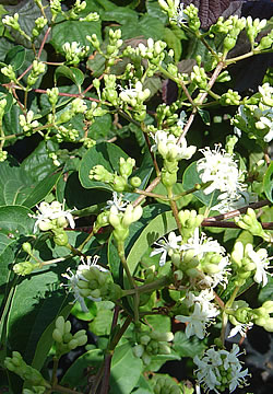Sieben-Söhne-des-Himmels-Strauch (Heptacodium miconioides): Eigentlich schade, dass er in Gärten eher selten anzutreffen ist. So auffällig wie sein Name ist auch seine Erscheinung mit seiner abblätternden Rinde. Es ist ein buschig aufrecht wachsender mehrstämmiger Grossstrauch, der auch Trockenheit gut verträgt. Er wird 3 – 4 m hoch. Im Alter wächst er schirmförmig. Der Standort sollte sonnig bis halbschattig und der Boden nahrhaft sein. Die Rispen mit den crème-weissen stark duftenden Blüten erscheinen von August bis Oktober – dann, wenn so manches andere bereits verblüht ist. Dieser Strauch eignet sich auch gut als Kübelpflanze.