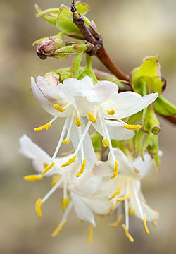 Winter-Duftheckenkirsche (Lonicera purpusii): Dieser pflegeleichte Strauch mit dem malerischen leicht überhängenden Wuchs wirkt sehr schön in naturnahen Gärten, aber auch als Kübelpflanze. Er kommt mit jedem Standort zurecht; nur zu trocken darf er nicht sein. Die Wuchshöhe beträgt 1.8 – 2 m und ist deshalb auch für kleine Gärten gut geeignet. Bienen und andere Insekten haben über eine sehr lange Zeit ein Nahrungsangebot. Je nach Witterung kann sich die Blütezeit von Dezember bis April erstrecken, mit Hauptblüte von Februar bis März. Die crème-weissen lippenförmigen Blüten verströmen einen starken Duft.