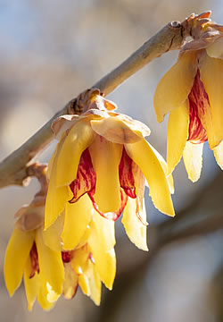 Winterblüte (Chimonanthus praecox): Die Winterblüte ist ein sparrig verzweigter, schwach wachsender Strauch. Mit der geringen Höhe von nur 1.5 – 2 m ist er auch für kleine Gärten ideal. Der Standort soll sonnig bis leicht halbschattig und geschützt sein; der Boden gut durchlässig. Die sehr stark duftenden gelben glockenförmigen Blüten mit der purpurfarbenen Mitte erfreuen von Dezember bis März. Da sich die Blütezeit über die gesamten Wintermonate erstreckt, ist dieses Gehölz für die Insekten besonders wertvoll.