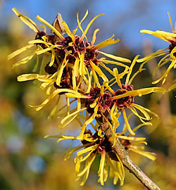 Zaubernuss (Hamamelis): Die Zaubernuss ist ein langsam wachsender Strauch mit breit ausladender, sparriger Form für einen sonnigen Standort. Sie wird 2 – 3 m hoch. Die meisten hier anzutreffenden Hamamelis-Arten blühen von Januar bis März, am noch kahlen Holz. Einzig die Virginische Zaubernuss (Hamamelis virginiana) blüht im Herbst. Je nach Art und Sorte sind die filigranen Blüten schwefelgelb, goldgelb, orange oder kupferrot und meist süss duftend. Bei den im Winter blühenden Arten rollen sich bei Frost die Blütenblättchen ein, so kann ihnen auch grosse Kälte nichts anhaben.